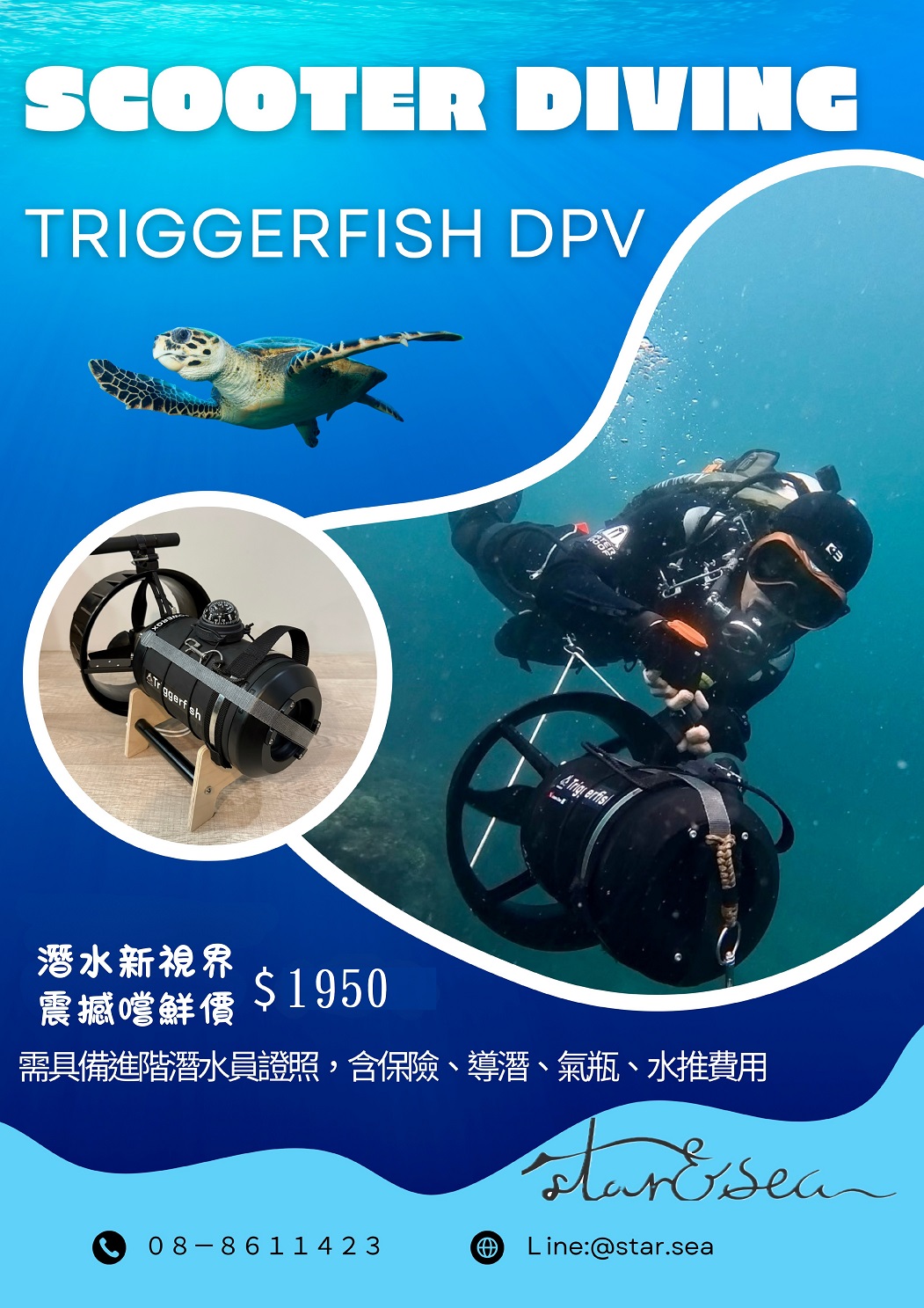 一人報名$1000/1潛,二人以上報名每人$800/1潛,需潛水證照才可報名。 含教練、氣瓶、潛水險、盥洗。不含潛水裝備。